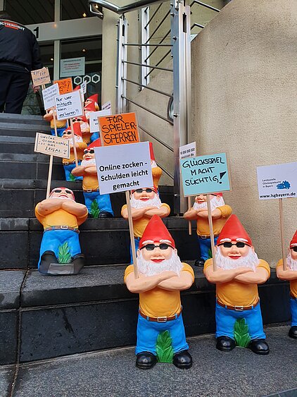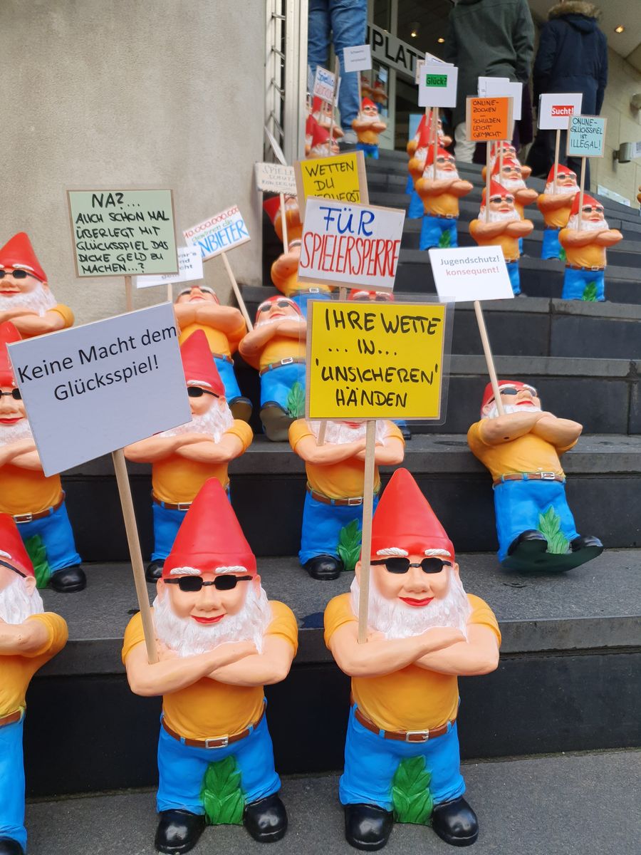Anlässlich der Verbändeanhörung zum Entwurf des neuen Glücksspielstaatsvertrags haben wir vor der Staatskanzlei in Düsseldorf einen (Zwergen-) Aufstand organisiert, um für mehr Spielerschutz und eine stärkere Reglementierung der Glücksspielanbieter zu demonstrieren.