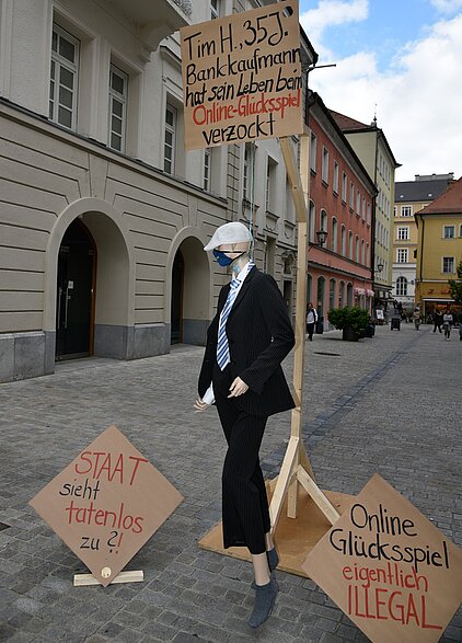Als Standort für unseren Informationsstand wählten wir den Europabrunnen, der unmittelbar vor der Regensburger Fußgängerzone liegt. Mit einer Puppe am Galgen zeigten wir die Tatsache auf, dass pathologische Glücksspieler besonders suizidgefährdet sind. Viele interessierte Passanten kamen an unseren Stand, sodass wir unsere Aktion einen vollen Erfolg nennen können.